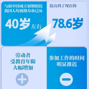 与新中国成立初期相比,我国人均预期寿命已从40岁左右提高到了现在的78.6岁,同时劳动者受教育年限大幅增加,参加工作的时间明显推迟。另一方面,我国16至59岁劳动年龄人口数量持续下降,60岁及以上老年人却不断增多。