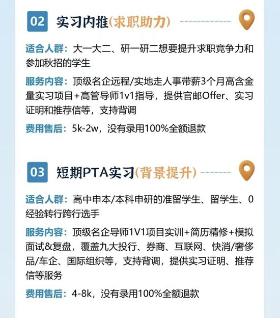 一家实习中介推出的收费服务项目,其中“实习内推”承诺“没有录用百分之百全额退款”