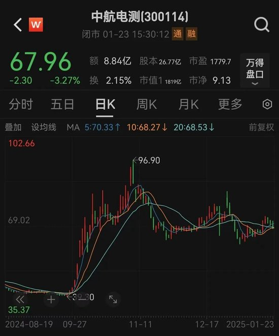 1月23日,中航电测股价以67.96元报收,最新市值为1819亿元,高于中航沈飞1300亿元的最新市值。