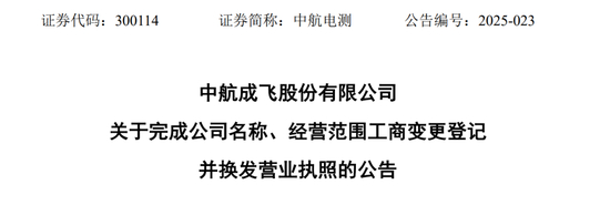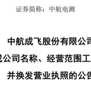 中航电测1月23日晚间公告,近日,公司名称、经营范围变更事项已完成工商变更登记手续,并取得陕西省市场监督管理局换发的《营业执照》,公司名称已由“中航电测仪器股份有限公司”变更为“中航成飞股份有限公司”。