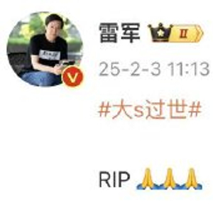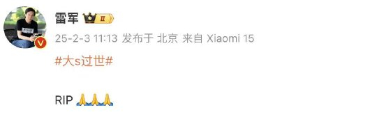 今日午间,小米创始人雷军微博发文“RIP (Rest in Peace愿逝者安息)”,缅怀大S。