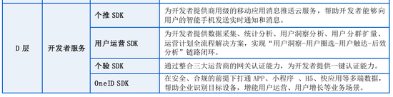 比如,“个验SDK”,是通过整合三大运营商的网关认证,为开发者提供一键认证能力;“个推SDK”是为开发者提供商用级的移动应用消息推送云服务,帮助开发者能够向用户的智能手机发送实时通知和消息。