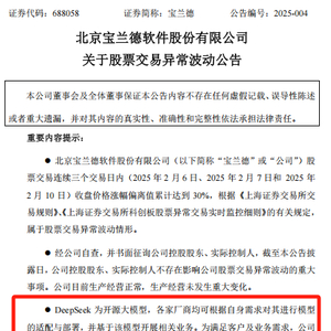 宝兰德发布股价异动公告称,公司产品AI智慧助手等有部分业务接入DeepSeek相关模型,但相关收入占营业收入比例极小,对公司业务开展无实质性影响。