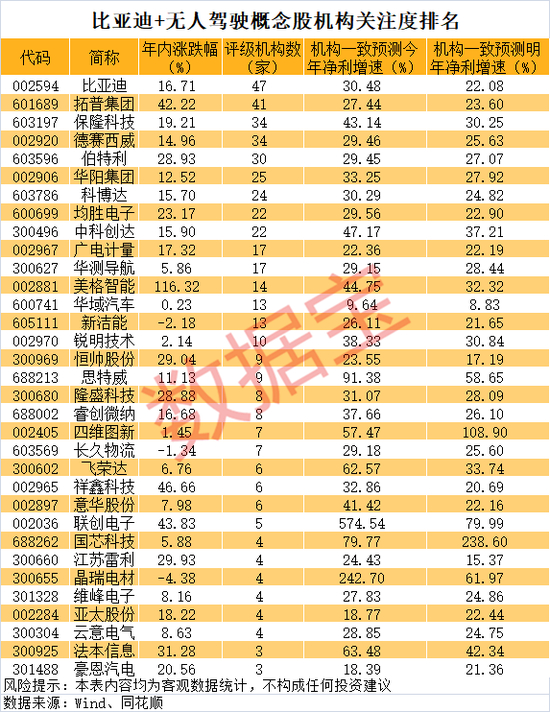数据宝从数据角度梳理出同时有比亚迪概念和无人驾驶概念的个股,这类股票受益于比亚迪智驾的概率更高,合计有33只股票评级机构数在3家及以上。从成长性来看,保隆科技、中科创达、美格智能、锐明技术、飞荣达等个股机构一致预测今明两年净利增速均超30%。