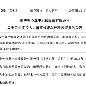 2月17日,美心翼申发布公告称,公司于2月14日收到由忠县监察委员会签发的《留置通知书》,公司实际控制人、董事长兼总经理徐争鸣被实施留置。截至本公告披露日,公司未收到相关机关的其他通知,也未被要求协助调查。