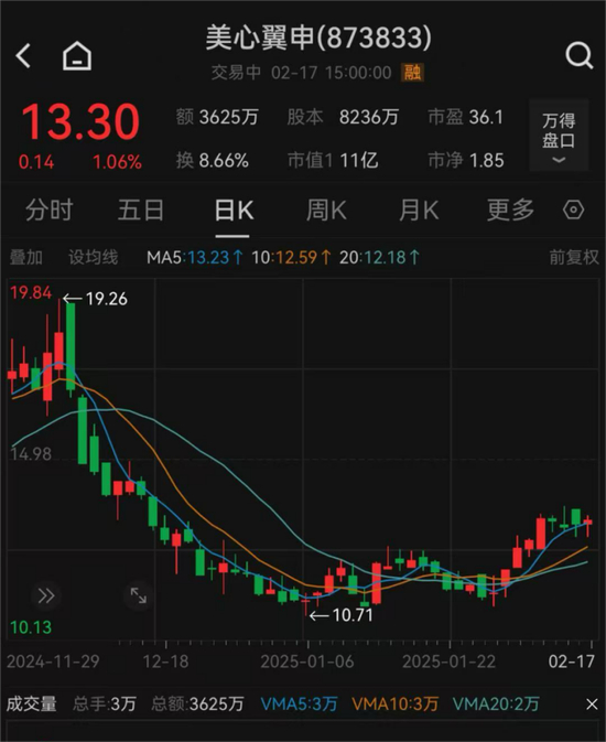 截至2月17日收盘,美心翼申每股报13.3元,最新市值为11亿元。