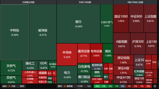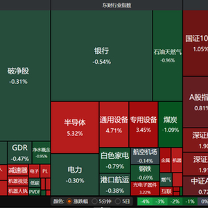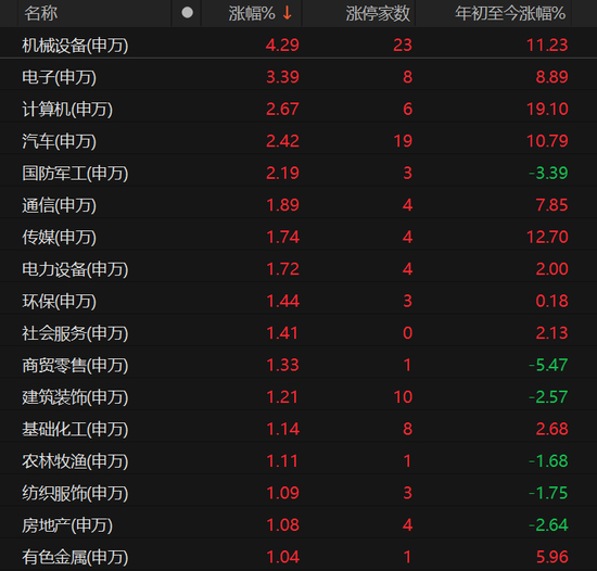 31个申万一级行业中,煤炭、银行等周期股微跌,其他26个飘红,尤其是科技板块涨幅靠前,机械设备板块涨幅超过4%,电子板块以3.39%涨幅紧随其后,计算机、汽车、国防军工、通信、传媒、电力设备板块均表现不错。