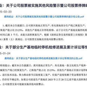 根据相关规定,因“生产经营活动受到严重影响且预计在三个月内不能恢复正常”,晨鸣纸业股票交易已触及其他风险警示情形,将于2月21日开市起被ST。