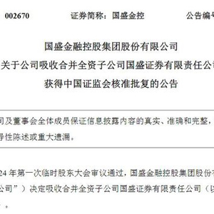 2月19日晚间,国盛金控发布公告称,公司于当日收到中国证监会出具的批复文件,核准国盛金控吸收合并国盛证券,吸收合并完成后,国盛证券解散,国盛金控名称变更为新国盛证券。