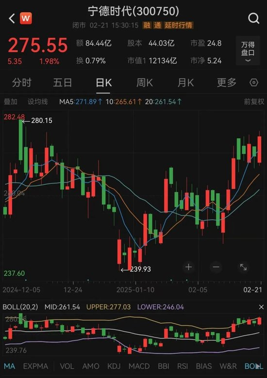 截至2月21日收盘,宁德时代股价收于275.55元/股,涨幅达1.98%,总市值为1.21万亿元。