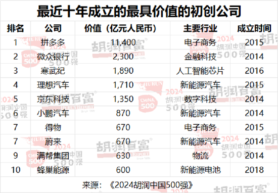 在最近10年成立的价值最高的初创企业前十名中,从事电子商务和半导体行业的企业数量最多。电子商务领域包括拼多多、得物等,半导体领域则包括寒武纪、地平线机器人和中科飞测等。