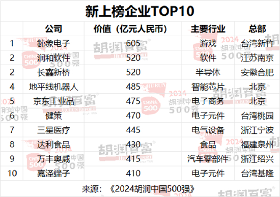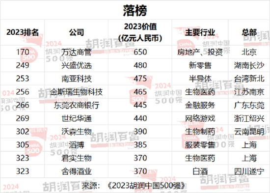 13%(66家)上一年榜单中的企业今年落榜。其中包括万达商管,其市值因房地产市场的整体低迷而下跌;兴盛优选,因行业同质化竞争加剧;南亚科技,因消费性电子需求疲软等导致营收下滑;世纪华通,因涉及财报披露信息虚假而被ST;以及生物医药企业金斯瑞生物科技,面临激烈的市场竞争和日益严格的政策监管。
