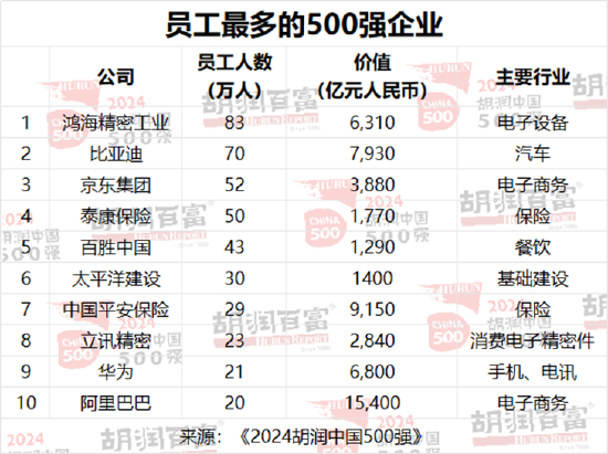 另一方面,有29家企业的员工人数超过10万人。在这些大型企业中,鸿海精密工业、比亚迪和京东的员工人数位居前三,分别拥有83万、70万和52万名员工。