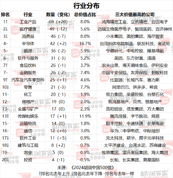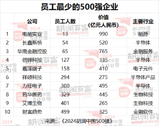 “胡润中国500强企业的营收比上一年增长了3%,而价值则上涨了13%。一些胡润中国500强最具价值的企业,其销售额和员工数量之低令人惊叹。具体来看,有11家企业年销售额不足10亿元,比如人工智能芯片企业寒武纪,销售额才7亿元,但价值却接近2000亿元;创新型生物医药企业百利天恒销售额才6亿元,但价值700多亿;两家自动驾驶公司文远知行和小马智行销售额才四五亿,但价值300多亿。此外,还有8家企业的员工数量不足400人,例如价值495亿的台湾半导体公司力旺电子、价值445亿的台湾生物科技公司药华医药,以及新上榜的价值410亿的电子元件企业嘉泽端子等。”