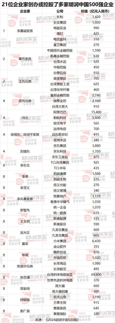 “创建一家胡润中国500强企业本身就是一项非凡的成就,然而有21位企业家不仅做到了这一点,还创办或控股了不止一家这样的企业,他们共创办或控股了54家胡润中国500强企业。其中,李嘉诚家族创办或控股了6家胡润中国500强企业。台湾的王永庆、王永在兄弟的后代以及辜振甫的后代均创办或控股了4家胡润中国500强企业。同样来自台湾的蔡明忠、蔡明兴兄弟以及徐旭东、徐旭平家族也分别创办或控股了3家胡润中国500强企业。这些企业家的成功彰显了他们在各自领域的深远影响力和持续创新的能力。”