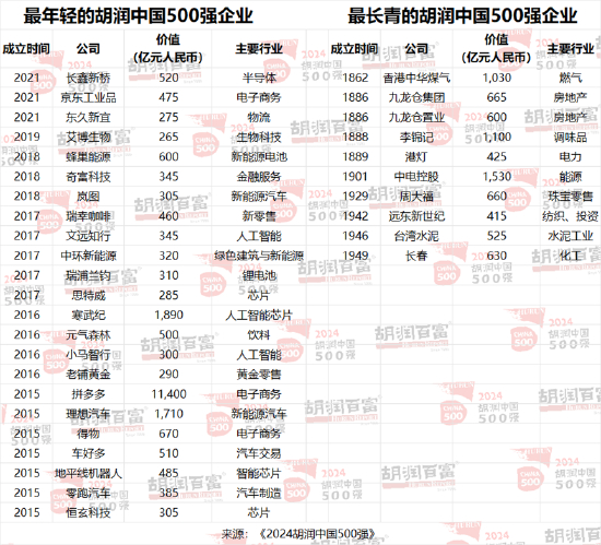 “在胡润中国500强企业中,有40多家企业的历史超过50年,其中超过七成的企业来自香港和台湾。特别值得一提的是,有6家企业拥有百年以上的历史,且全部来自香港,包括160多岁的香港中华煤气、130多岁的房地产企业九龙仓置业和九龙仓集团,以及知名的李锦记等。此外,其他历史悠久的500强企业还包括90多岁的周大福、80多岁的远东新世纪等。”