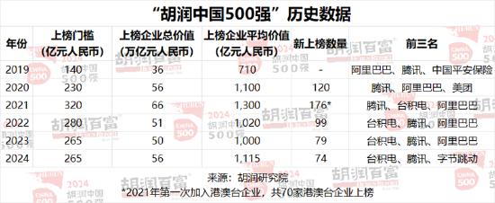 《2024胡润中国500强》榜单的上榜门槛与上一年持平,维持在265亿元。500强企业的总价值比上一年上涨6.6万亿元(13%),达到56万亿元。平均价值比上一年上涨115亿元,达到1115亿元。在上榜企业中,有291家企业的价值比上一年有所增长,其中包括74家新上榜企业;34家企业的价值与上一年持平;184家企业的价值有所下降。57%是B2B企业,比上一年增加2%。43%直接面向消费者。74%的企业提供实体产品,比上一年增加3%。26%提供软件或服务。500强企业的平均年龄为29岁,即平均成立于1995年。