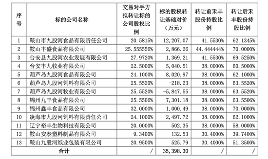 公告显示,为推动公司白羽肉鸡事业发展,进一步整合肉禽产业股权,禾丰股份拟以自有及自筹(如需)资金收购金天明、马力、金鑫持有的鞍山市九股河食品有限责任公司、鞍山丰盛食品有限公司、台安县九股河农业发展有限公司、台安丰九牧业有限公司、葫芦岛九股河食品有限公司、葫芦岛九股河饲料有限公司、葫芦岛九股河牧业有限公司、锦州九丰食品有限公司、锦州鑫丰食品有限公司、凌海市九股河饲料有限责任公司、辽宁裕丰生物科技有限公司、鞍山安泰塑料制品有限公司、鞍山九股河纸业包装有限公司等13家公司部分股权,本次交易的基础对价合计为3.54亿元。