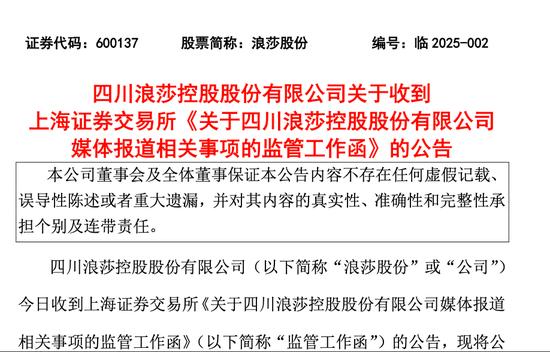 3月16日,浪莎股份收到上海证券交易所下发的《关于四川浪莎控股股份有限公司媒体报道相关事项的监管工作函》,要求公司核实媒体报道内容,说明是否存在相关情况及是否涉及信息披露违法违规。