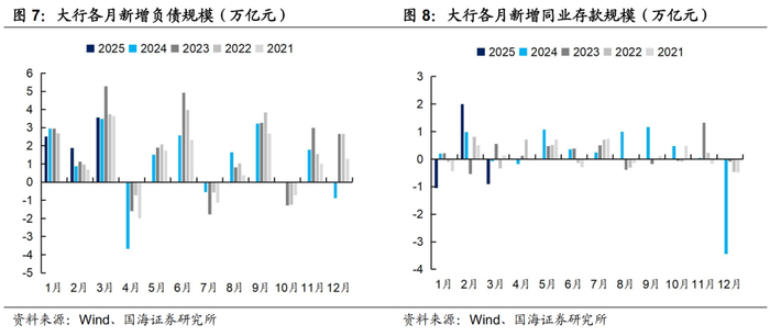 ②配置盘方面,大行负债端仍维持紧张状态,配债需求存在不确定性。3月大行新增负债3.6万亿元,同比增加832亿元,主要是大量发行同业存单、商金债等金融债券所致,而存款,尤其是同业存款的同比规模仍然有明显减少,同业存款回流仍然需要时间,对利率债的需求与信贷投放密切相关,存在不确定性。