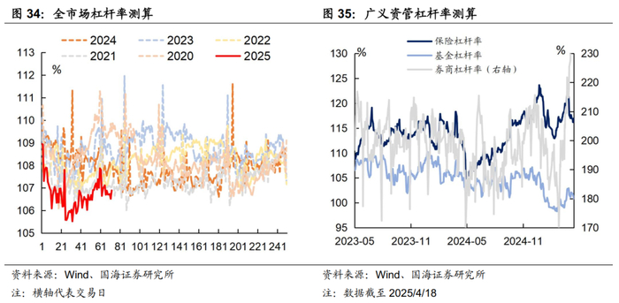 本周全市场杠杆率为106.9%,较上周基本保持不变。广义资管方面,本周保险机构杠杆率录得116.5%,较上周减少0.4个百分点;基金杠杆率录得100.8%,较上周减少1.1个百分点;券商杠杆率录得235.3%,较上周减少5.0个百分点。