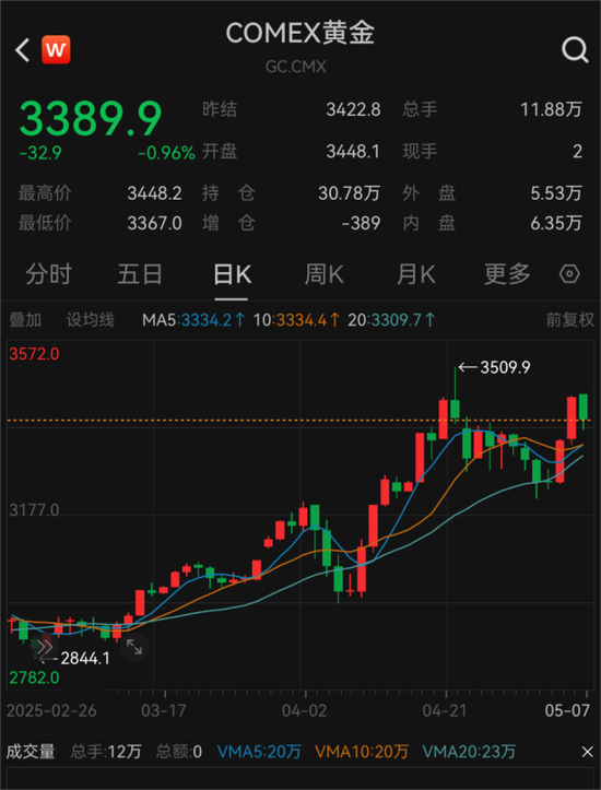 5月以来,国际金价表现持续震荡。截至发稿,COMEX黄金报3389.9美元/盎司,下跌0.96%;伦敦金现报3374.325美元/盎司,下跌1.65%。