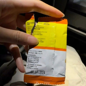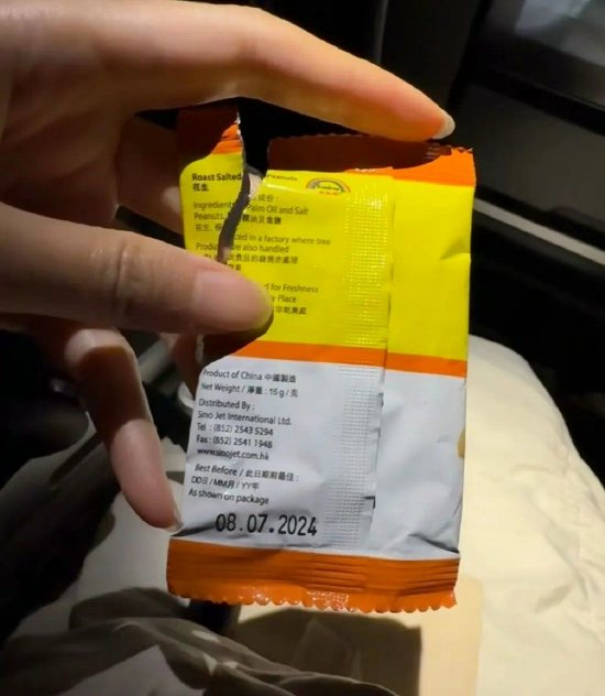 该网友称,她给孩子吃的时候并没有检查,孩子吃了半包就递给她。她接着吃,吃完随手翻过来,看到包装上显示最佳食用期为2024年7月8日前,觉得不可思议。“我把包装袋交给空姐,我说这个过期了,她说她确认一下,就没有下文了,连道歉都没有!”