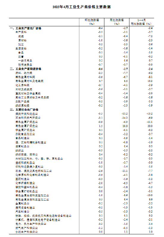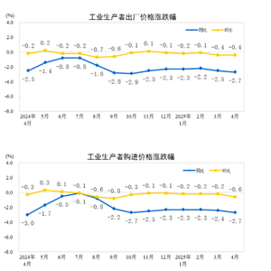 2025年4月份,全国工业生产者出厂价格同比下降2.7%,环比下降0.4%;工业生产者购进价格同比下降2.7%,环比下降0.6%。1—4月平均,工业生产者出厂价格和购进价格比上年同期均下降2.4%。
