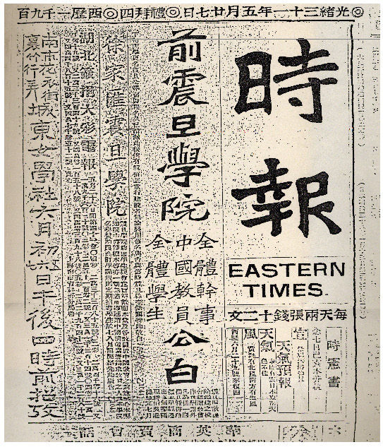 光绪三十一年五月廿七日《时报》刊登的《震旦学院全体干事、中国教员、全体学生公启》,向社会宣告震旦学院全体中国教职员工脱离震旦,另创新校