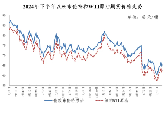 调价周期内,供应过剩担忧加剧、地缘风险演变、国际经贸环境变化等因素致使国际油价呈先抑后扬走势。以布伦特原油期货为例,价格一度跌至年内低点,约每桶60美元,随后快速上涨,最高涨至67美元左右。一方面,5月初“OPEC+”宣布次月继续大幅增产,加剧市场对供应过剩的担忧,导致国际油价走低。另一方面,加沙局势趋于恶化、美伊谈判跌宕,加剧中东紧张局面,带动油价止跌上涨;随后在中美经贸谈判取得实质进展的情况下,国际经贸紧张局势有所缓和,油价进一步震荡上涨。需要注意的是,国际原油市场总体仍供过于求。国际能源署5月报告显示,未来全球石油供应量增幅将大大超过需求量增幅,预计2025年石油库存平均将增加72万桶/日,2026年将增加93万桶/日。