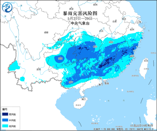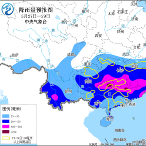 5月27日至29日,贵州、江南、华南等地有大到暴雨,江南南部、华南北部等地的部分地区有大暴雨,局地有特大暴雨;其中,贵州东南部、湖南南部、江西南部、广西北部、广东北部、福建南部等地累计降雨量有80~180毫米、局地300~350毫米;上述地区有短时强降雨,局地伴有雷暴大风、冰雹等强对流天气。