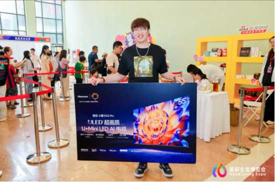 本次展会,有幸运观众获得了现场扭蛋机大奖,抱走大奖最新款55寸海信电视。他向新浪财经表示,来之前没想到会抽中大奖,感觉“挺不真实的”,调侃自己很幸运地“可以买张彩票试试试”。