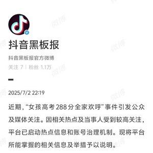 近期,“女孩高考288分全家欢呼”事件引发公众及媒体关注。因相关热点及当事人受到较高关注,平台已启动热点信息和账号治理机制。现将平台所能掌握的相关信息及举措予以说明。