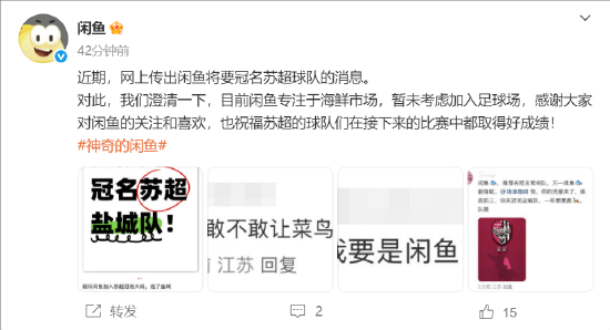 闲鱼否认将冠名“苏超”球队:专注于海鲜市场,暂未考虑加入足球场
