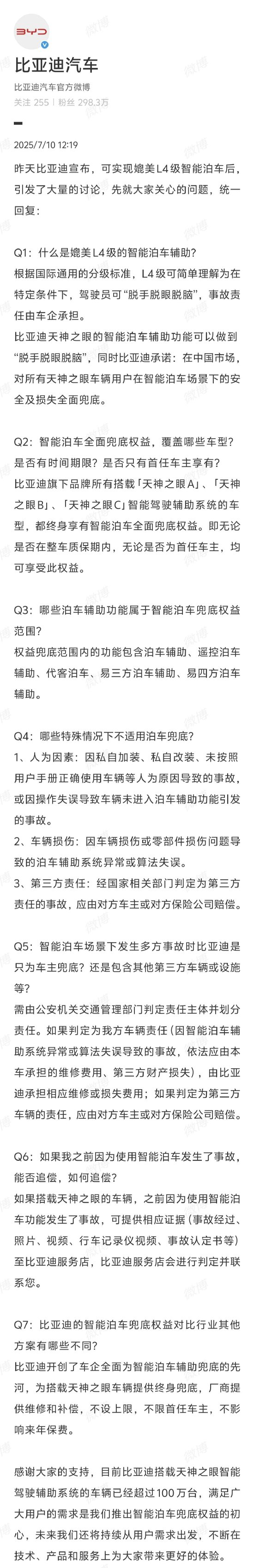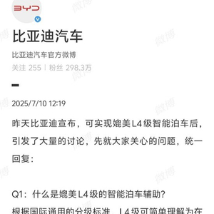 新浪科技讯 7月10日午间消息,昨日比亚迪宣布,可实现媲美 L4 级智能泊车后引发大量的讨论。比亚迪汽车官方今日微博发文,就大家关心的问题进行了统一回应。