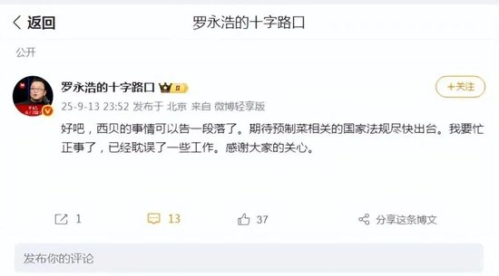 9月13日晚,罗永浩发布微博称,“西贝的事情可以告一段落了,期待预制菜相关的国家法规尽快出台”。