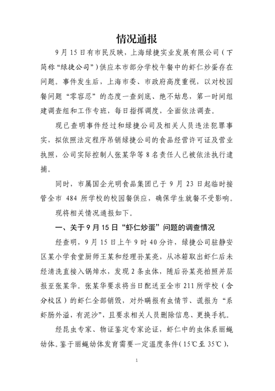 上海市场监管局发布情况通报,9月15日有市民反映,上海绿捷实业发展有限公司(下简称“绿捷公司”)供应本市部分学校午餐中的虾仁炒蛋存在问题。事件发生后,上海市委、市政府高度重视,以对校园餐问题“零容忍”的态度一查到底、绝不姑息,第一时间组建调查组和工作专班,每日指挥调度,全面依法调查。