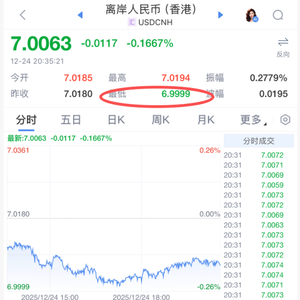人民币汇率涨势不断,12月24日晚间,离岸人民币兑美元一度升穿7.0关口,最低报6.9999。