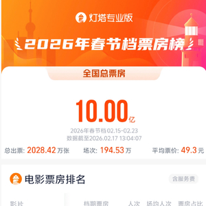 据大麦娱乐旗下灯塔专业版数据显示,截至2月17日13时04分,2026春节档(2月15日-2月23日)档期总票房(含预售)已突破10亿元。