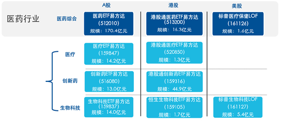 比如易方达的医药指数产品就很全,覆盖了A股、港股、美股三个市场,还有创新药、医疗、生物科技等细分方向,不管是想投整体还是投细分,都有对应的选择。