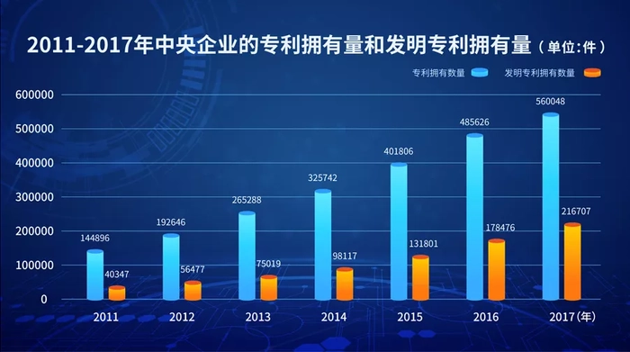 ▲2011-2017年,中央企业拥有各类有效专利总量从14.49万件增加到56万余件,年均增长25.27%,其中有效发明专利从4.03万件增加到21.67万件,年均增长32.36%。