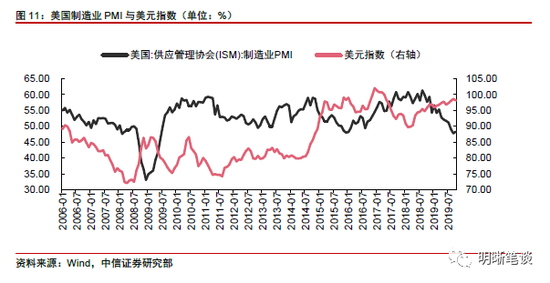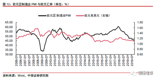 从欧元区经济以及欧元走势上,同样可以看到美元指数所面临的压力,欧元区制造业PMI已下行至低位水平,英国脱欧不确定性减弱,欧元未来或将走强,欧元走强将带动美元指数下行,提振人民币汇率。从欧元区制造业PMI与欧元汇率的走势上来看,欧元区制造业景气程度与欧元走势相关性较高,当前欧元区制造业PMI已处于危机后低点水平,且近期略有企稳,而政治事件方面随着欧盟同意英国脱欧延期,英国“无协议脱欧”风险减弱,欧元未来或将走强。欧元作为美元指数权重占比最大的组成部分,欧元的走强将带来美元指数的下行,从而提振人民币汇率,带来人民币汇率的升值。