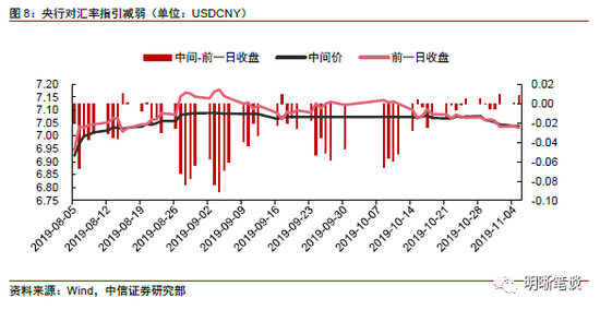 近期中美贸易谈判进展促进了人民币的升值。随着10月12日,中美重启贸易谈判之后,谈判不断取得进展,人民币汇率有了较大幅度的升值。11月5日美国商务部长罗斯表示,中美贸易谈判正在向完成第一阶段谈判而努力,并且正在取得很好的进展,这部分谈判主要是围绕当前的贸易问题,如天然气、大豆等。罗斯再次强调,他对于达成第一阶段的贸易协议有理由感到乐观。在贸易摩擦缓和以及央行小幅度下调MLF利率的情况下,11月5日,离岸市场美元兑人民币汇率跌破了7的整数点位。