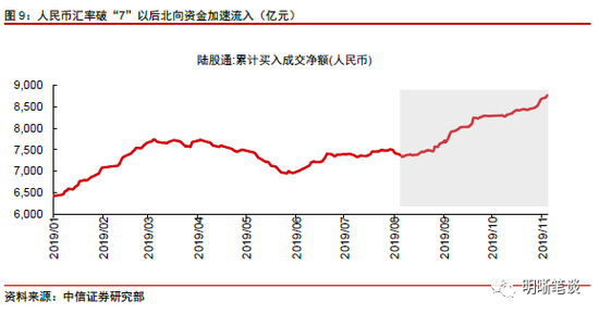 北向资金8月以来持续流入,目前已处于年内高点,北向资金的持续流入推动人民币升值。从陆股通反映的北向资金流入角度来看,今年8月份陆股通累计流入处于阶段性低位,而自在岸人民币8月5日突破“7”的关口以后,北向资金持续涌入并超过此前3月份的高点水平。截至11月5日,当前北向资金累计流入8767.8亿元。北向资金的持续流入主要原因在于,此前人民币汇率持续位于7以下位置,境外资金普遍对于人民币是否会大幅贬值存在担忧,而当人民币汇率充分贬值以后,保持弹性的人民币汇率反倒使得境外资金的忧虑解除,北向资金开始涌入,推动人民币升值。