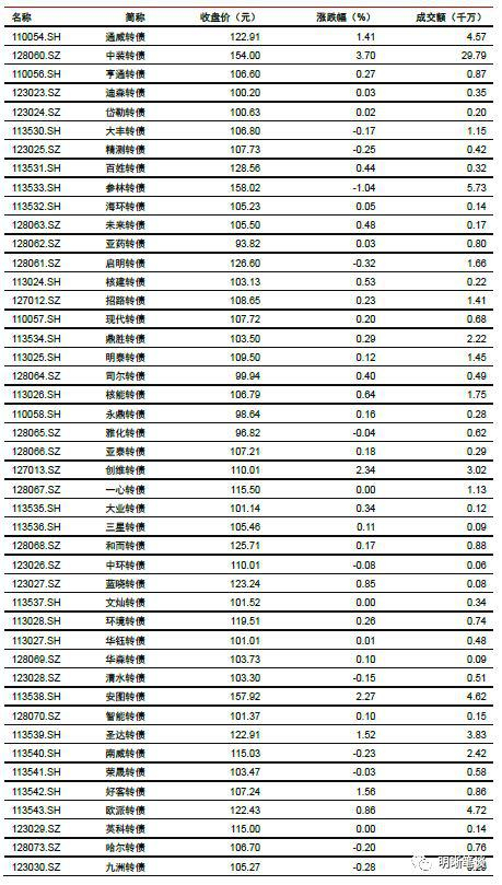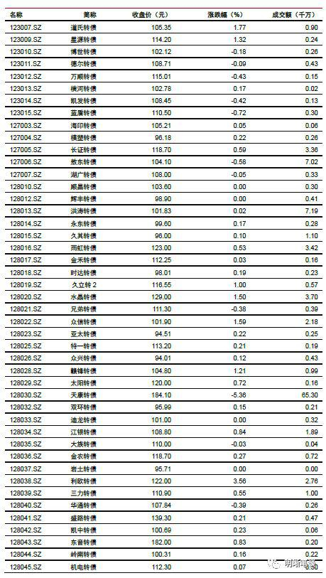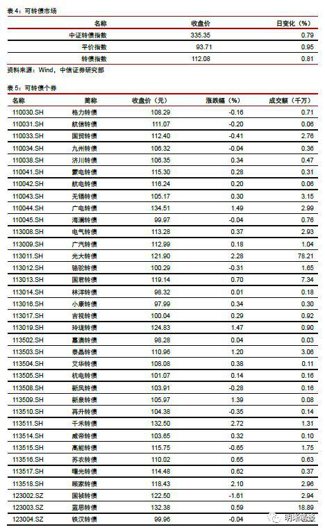 11月5日转债市场,平价指数收于93.71点,上涨0.95%,转债指数收于112.08点,上涨0.81%。177支上市可交易转债,除英科转债、一心转债、迪龙转债、文灿转债、今飞转债、顺昌转债和辉丰转债横盘,岩土转债停牌外,121支上涨,48支下跌。其中,寒锐转债(4.82%)、中装转债(3.70%)、利欧转债(3.56%)领涨,天康转债(-5.36%)、联泰转债(-1.64%)、国祯转债(-1.61%)领跌。177支可转债正股,除模塑科技、澳洋顺昌、亚太股份、伊力特、德尔未来、招商公路、司尔特、游族网络和远东传动横盘,中化岩土停牌外,92支上涨,75支下跌。其中,众信旅游(10.04%)、好莱客(7.80%)、寒锐钴业(7.39%)领涨,大丰实业(-5.44%)、亚太药业(-4.26%)、联泰环保(-3.32%)领跌。