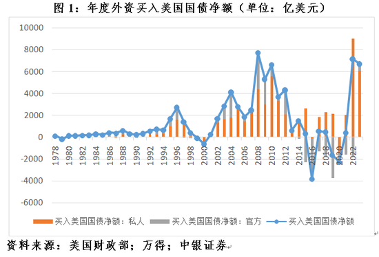 美国财政部发布的月度国际资本流动报告(TIC)数据显示,2022年,受美联储激进紧缩,美元指数和美债收益率飙升影响,全球遭遇“美元荒”。全年外资累计净买入美国国债7166亿美元,远超过上年净买入423亿美元的规模,仅次于2008年净买入7724亿美元。其中,私人外资净买入8988亿美元,创历史纪录;官方外资净卖出1822亿美元,为连续九年净卖出,部分反映了非美货币当局干预本币汇率贬值的影响(见图1)。但是,因为美债收益率飙升、美债价格暴跌产生负估值效应1.17万亿美元,外资持有美债余额减少4503亿美元,为史上年度最大降幅。