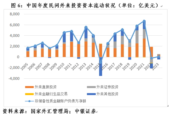 2023年,中国民间资本项目(即非储备性质的金融账户)净流出2099亿美元,较上年下降474亿美元,减少18.4%。其中,民间对外投资(即非储备性质的金融账户资产方)净流出2234亿美元,下降153亿美元,减少6.4%,贡献了总降幅的32.3%;外来投资(即非储备性质的金融账户负债方)净流入134亿美元,增加321亿美元,贡献了总降幅的67.7%(见图5)。这显示汇率下跌对于国际资本流动“奖入限出”的调节作用正常发挥。