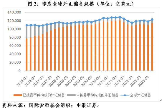 根据IMF披露的最新数据,截至2023年底,全球外汇储备规模12.33万亿美元,全年增加4147亿美元,上年为减少1.01万亿美元。这既反映了资产价格和汇率变动引起的估值效应由负转正(其中,IMF披露的七种非美主要储备货币汇率变动引起的估值效应合计由-2930亿美元转为+779亿美元),也反映了非美货币当局干预本币汇率贬值的压力减轻,与前述美联储紧缩节奏和力度的变化相契合。同期,全球已披露币种构成的外汇储备规模为11.45万亿美元,增加4094亿美元,上年为减少1.01万亿美元;未披露币种构成的外汇储备规模为8831亿美元,增加54亿美元,上年为增加22亿美元(见图2)。