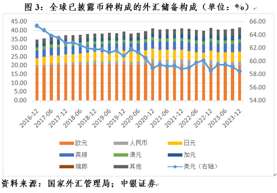 由上可知,非传统的储备货币是国际储备货币体系多元化的重要受益者。拉长时间看,这一趋势更加明显。截至2023年底,美元储备份额较2016年底(IMF首次将人民币纳入主要储备货币对外披露)下降6.95个百分点,日元、其他货币、人民币、欧元、加元、英镑、澳元、瑞郎储备份额分别上升1.75、1.53、1.21、0.84、0.64、0.49、0.42、0.07个百分点(见图3)。
