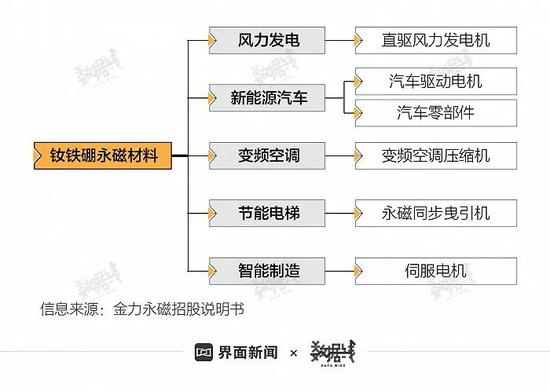 稀土磁材即钕铁硼永磁材料,是继第一、二代钐钴永磁材料后的第三代永磁材料,具有高剩磁、高矫顽力和高磁能积等特性,被广泛运用于风电、新能源汽车、变频空调与节能电梯等领域。